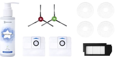 Med Ecovacs Deebot X1 Omni/ X1 Turbo tillbehörskit DKT010027 kommer du alltid ha tillgång till helt nya delar om du behöver ersätta någon. Förpackningen består av 2 sidoborstar, 1 högeffektivt filter, 2 dammpåsar, 4 moppdukar och 1 flaska av 110 ml rengöringsmedel. Enligt rekommendationer bör du byta ut moppdukarna 4 gånger per år, sidoborstarna 2 gånger per år och filtrerna 3 gånger per år.