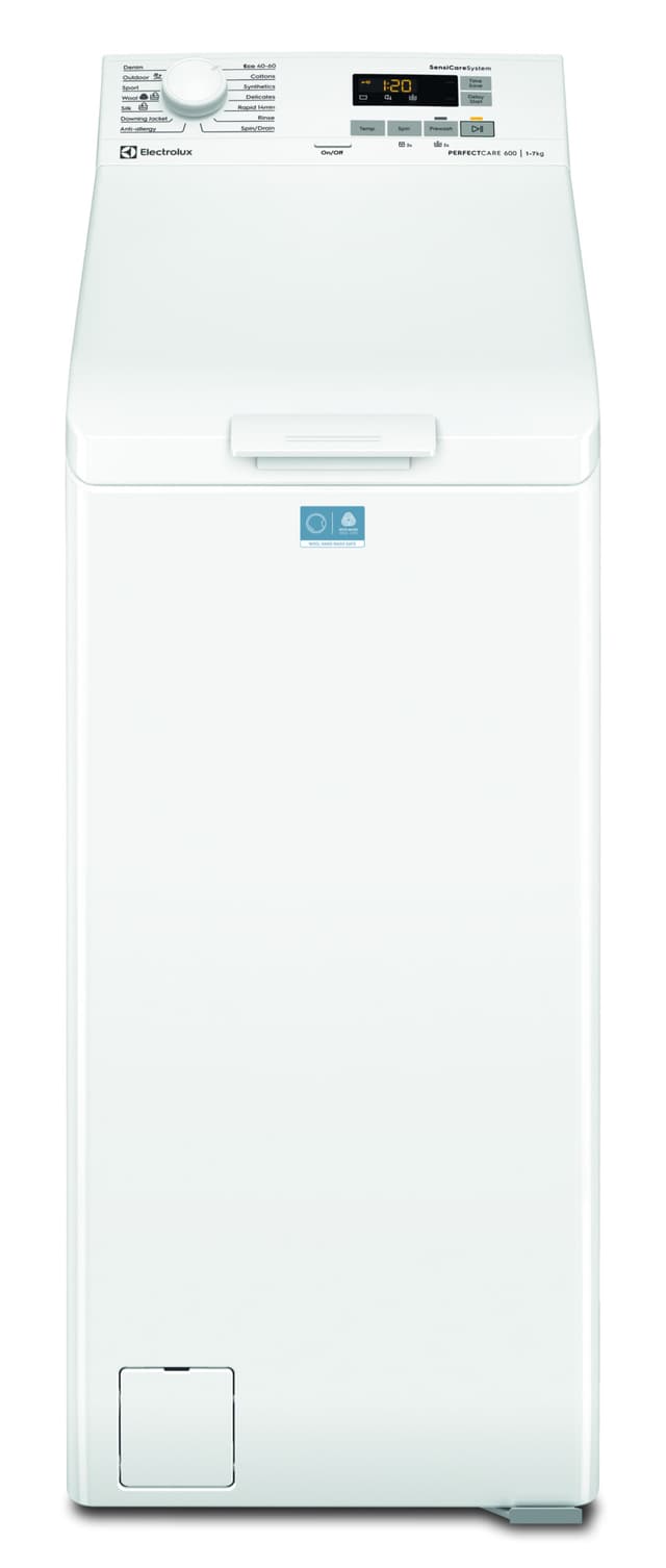 Den toppmatade 600-tvättmaskinen med SensiCare-system justerar programmets längd efter tvättmängd. Den använder rätt mängd vatten, tid och energi för att sköta kläderna, oavsett tvättens storlek. Kläderna bevaras dubbelt så länge.