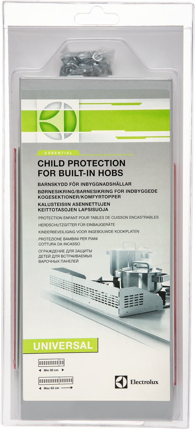 Electrolux barnskydd för inbyggnadshällar. Bredd: min 50 cm, max 63 cm. Universalskydd, enkel att installera håller barns nyfikna fingrar borta från heta kastruller och pannor så att de inte bränner sig. Innehåller 1st.Läs mer om produkten