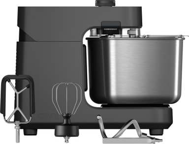 Denna kompakta köksmaskin är perfekt för små utrymmen. Stänkskyddet håller ditt kök rent. Den har en roterande rostfri blandningsskål, en avtagbar arm och tillbehör som visp, blandare och degkrok - alla diskmaskinssäkra för enkel rengöring.