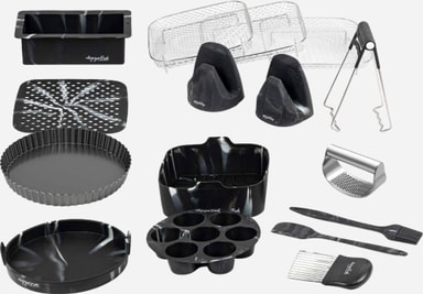 Panetti Trude AIRTRU13PPAN air fryer tillbehörsset innehåller 13 LFGB-certifierade bitar gjorda av slitstark silikon och metall, perfekt för airfryers 5,5 liter eller större. Varje del tål diskmaskin.Läs mer om produkten