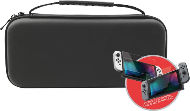Piranha Nintendo Switch fodral och skärmskydd har allt du behöver för att förvara din konsol. Du får ett skärmskydd av tåligt härdat glas och ett fodral med 8 fickor för dina spel. Fodralet har även ett hopfällbart ställ och kabelnät för dina laddare.