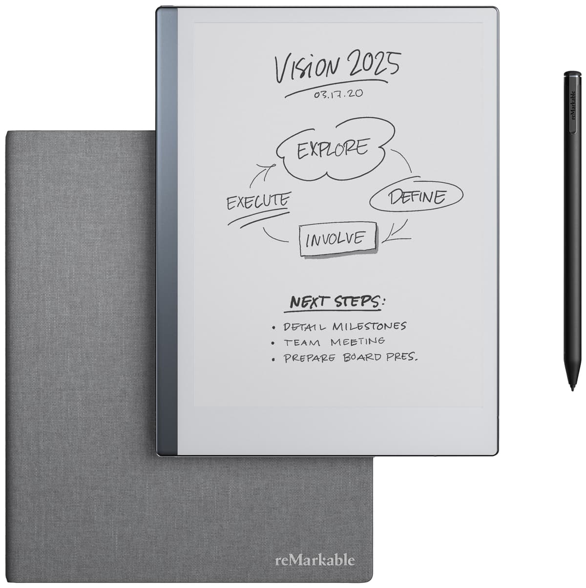 Samla allt du behöver för att vara så kreativ som möjligt på ett enda ställe: reMarkable 2 – surfplattan som har samma känsla som papper, Marker Plus,Book Folio i grått vävt polymertyg och 100 dagars Connect-prenumerationLäs mer om produkten