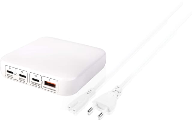 Med 3 USB-C-portar och 1 USB-A-port kan denna desktop-laddare samtidigt ladda upp till fyra enheter. Den tillgodoser olika laddningsbehov, från bärbara datorer till smartklockor, och erbjuder en komplett lösning för din teknikuppsättning.