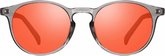 ZEN 18 sömnglasögon har en rund båge tillverkad i matt grå acetat som kombinerar stil och komfort. De röda glasen filtrerar varsamt bort skarpt blått ljus och skapar en mjukare, mer avslappnande vy som hjälper till att minska ögontrötthet vid nattligt arbete eller läsning. Dessa glasögon främjar bättre sömn genom att skydda dina ögon från skärmljus som kan störa din naturliga vila.