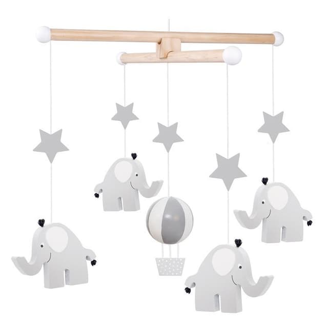 Söt mobil i trä att hänga upp ovanför sängen eller skötbordet i barnrummet. Mobilens färger och mönster hjälper till att stimulera barnets sinnen och rörelser under dess första månader.Trämobil med små elefanter och en liten luftballong i mitten.