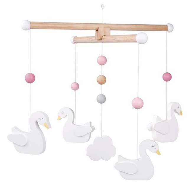 Söt mobil i trä att hänga upp ovanför sängen eller skötbordet i barnrummet. Mobilens färger och mönster hjälper till att stimulera barnets sinnen och rörelser under dess första månader.