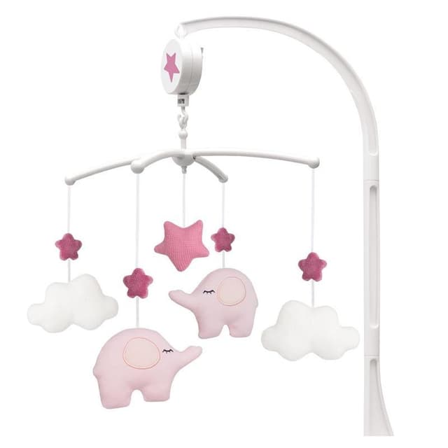 En söt musikmobil i mjuk textil som spelar en vaggvisa samtidigt som figurerna sakta snurrar runt. Perfekt att hänga över skötbordet eller spjälsängen. Mobilen har söta figurer i form av rosa elefanter och vita moln och stimulerar både barnets syn och hörsel samtidigt som det roar barnet.