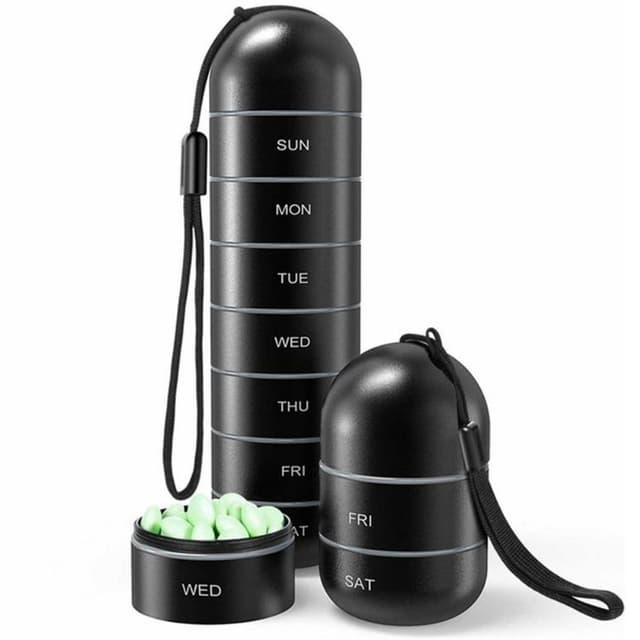 M032 Weekly Pill Organizer Stapelbar aluminiumlegering Resor 7-dagars Pill Box Fuktsäker Medicin Organizer Hållare - SvartDenna tablettbox är gjord av BPA-fri aluminiumlegering, som är ofarlig och lätt men robust.
