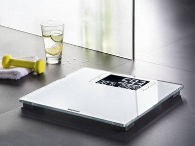 Design Med en snygg glasdesign och vit färg passar denna badrumsvåg i alla hem.