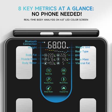 Användarvänlig Appintegration: Anslut enkelt vågen till din smartphone via Bluetooth och synkronisera din data till den användarvänliga appen. Appen ger tydliga och lättförståeliga visualiseringar av dina framsteg över tid. Spåra dina viktminsknings- eller muskelökningsmål, ställ in påminnelser och dela dina prestationer med vänner och familj. Appen lagrar din historiska data, vilket gör att du kan identifiera trender och mönster i din kroppssammansättning. LED-färgskärmen på själva vågen visar också viktiga mätvärden för snabba och bekväma avläsningar.