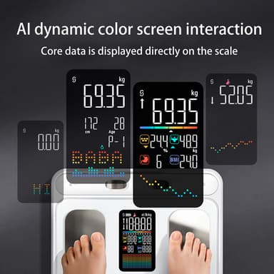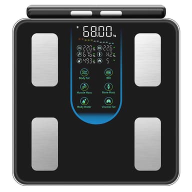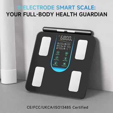 Omfattande Kroppsanalys: Denna smarta kroppsfettvåg använder avancerad bioelektrisk impedansanalys (BIA) teknologi med 8 elektroder för att ge en omfattande analys av din kroppssammansättning. Den mäter inte bara din vikt utan också kroppsfettprocent, muskelmassa, vattenprocent, benmassa, visceralt fett, basalmetabolism (BMR) och mer. Få en komplett bild av din hälsa och konditionsnivå med 45 professionella mätrapporter tillgängliga via den dedikerade appen. Denna detaljerade insikt låter dig spåra dina framsteg och fatta informerade beslut om din kost och träningsrutin.