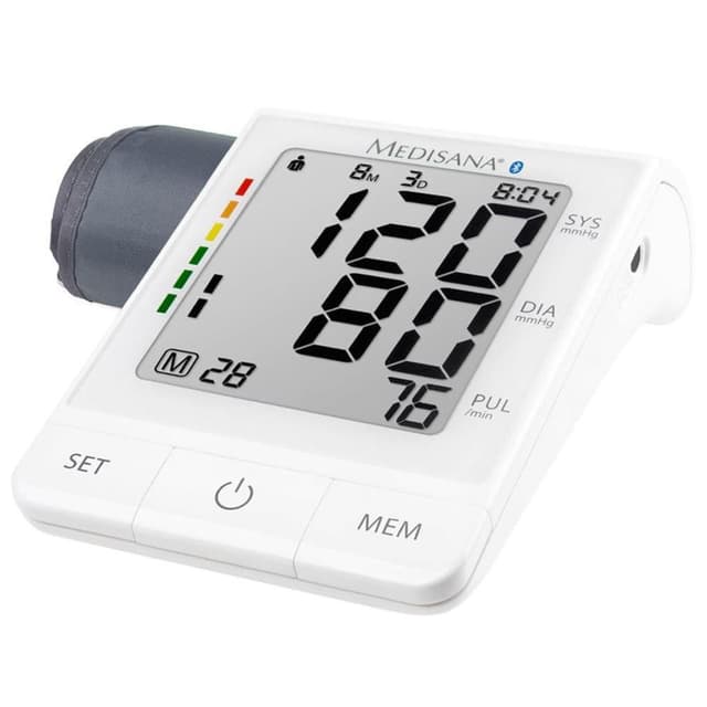 Medisana blodtrycksmätare BU 530 Connect 51174 för överarm är perfekt för självmätningar. Du kan använda den för att mäta ditt blodtryck regelbundet. Den här blodtrycksmätaren ger möjlighet att tilldela mätningar för 2 personer med 120 minnesplatser vardera. Displayen visar systole, diastole och puls, datum och tid. Den känner igen och visar arytmi. De mycket stora svarta siffrorna och LCD-displayen är mycket lätta att läsa. Denna blodtrycksmätare är lätt att använda. Med den nya VitaDock Online-portalen kan du nu lagra all din data på nätet och synkronisera den mellan flera iOS och Android-enheter för att få tillgång till den när som helst och var som helst. Leveransen omfattar en blodtrycksmätare, en överarmsmanschett, 1 bruksanvisning, 4 batterier och en förvaringsväska. Mått: 10 x 15,5 x 5,5 cm (B x L x H) Vikt: Ca. 0,4 kg Mätmetod: Oscillometrisk Blodtrycksmätområde: 0-299 mmHg Pulsområde: 40 - 199 slag/min. Exakt blodtrycksmätning på överarmen Arytmi-indikator 120 minnesplatser vardera för 2 användare Med mycket stora, lättlästa siffror Visning: Systoliskt, diastoliskt tryck, puls, datum, tid Bluetooth Smart (4.0) dataöverföring till VitaDock's app för iOS och Android och VitaDock Online Diagnos genom en trafikljusfärgskala enligt WHO's riktlinjer Beräknar medelvärdet av data från de senaste 3 resultaten Mätning för gäster utan att lagra läsningen är möjligt Valfritt mellan nät- eller batteridrift (nätadapter tillgängligt separat) 1 x Blodtrycksmätare för överarm, 1 x manschett för 22 - 36 cm övrerarms-omkrets, 1 x instruktionsmanual 4 x 1,5 V AAA-batterier och 1 x förvaringspåse