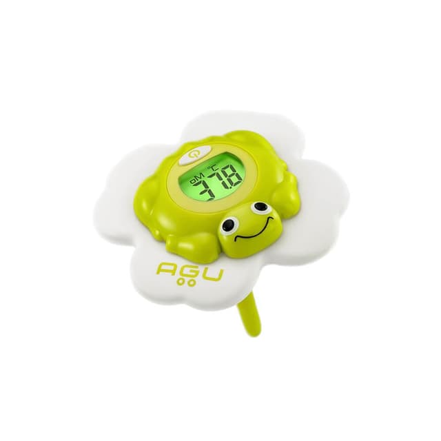 AGU Thermometer Froggy mäter vattentemperaturen var 30:e sekund. Den signalerar med en färgindikering om vattnet är ok, eller om det är för varmt eller för kallt. För din bebis är Froggy en rolig inlärningsleksak, en bra följeslagare för bad och den är helt säker. Tack vare den automatiska avstängningen - när Froggy är ute ur vattnet - kommer batteriet att hålla i evigheter.