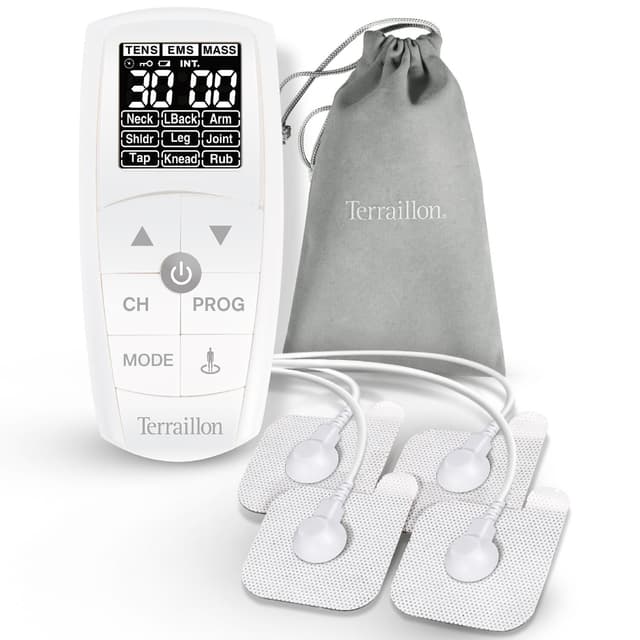 -Elektrisk muskelstimulering (EMS) applicerad genom två eller fyra elektroder och skickar elektriska impulser för att sammandraga slemmen för att förbättra och underlätta muskelprestanda. Detta elektrostimuleringssätt främjar muskelträning, återhämtning efter träning eller mindre skador och förbättrar blodcirkulationen. - Transkutan elektrisk nervstimulering (TENS) applicerad genom två eller fyra självhäftande elektroder och skickar elektriska impulser till specifika områden i kroppen för att lindra lokal smärta genom att stimulera nervändarna. Effektiv för att lindra smärta.