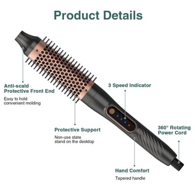 Snabb uppvärmning: Denna varmmuffsborste värms upp på några sekunder, vilket sparar tid och gör din morgonrutin snabbare. Du behöver inte vänta länge för att börja styla ditt hår.