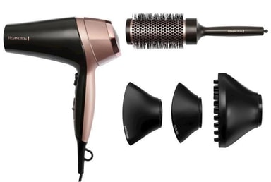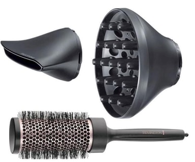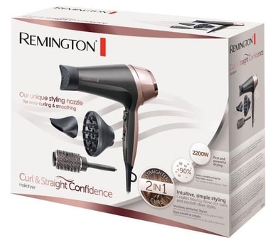 Remington Curl & Straight Confidence D5706 Låter dig styla ditt hår på ett enkelt och professionellt sätt. med de tre medföljande stylingmunstyckena får du allt som du behöver för att skapa din fina look. Curl & Straight har ett kraftfullt luftflöde på 90 km/h och ett bakre keramiskt galler som är lätt att ta av och rengöra från damm vid behov. Hårfönen har joniseringsfunktion så du slipper frissigt hår och flera värmelägen och hastigheter får att passa ditt behov.