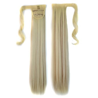 Blond med brunt undertill. Bredden på håret är ca 10cm och längden är ca: 60cm. Vikten på håret är 100 gram. Håret är tillverkat av syntetiska silkesfibrer, som ser ut och nästan känns som äkta hår. Med ett stort urval hårfärger och nyanser på löshåret kan du också enkelt matcha din ponytail med ditt naturliga hår.
