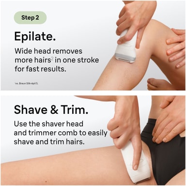 Det breda epilatorhuvudet täcker mer hud i ett drag jämfört med standardmodeller, vilket möjliggör snabbare hårborttagning på större områden som ben och armar.