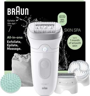 Braun Silk·épil 7 Skin Spa epilator SE7-081 är en sladdlös våt & torr epilator som håller din hud slät. Det breda huvudet avlägsnar mer hår med färre drag, MicroGrip-pincetterna fångar hår så korta som 0,5 mm, och medföljande tillbehör för exfoliering, massage, rakning och trimning skapar en komplett hudvårdsupplevelse hemma.