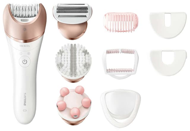Satinelle epilator från Philips med exfoliation-borste för kroppen och brett epilatorhuvud som avlägsnar hår och död hud och garanterar ett lent resultat.Läs mer om produkten