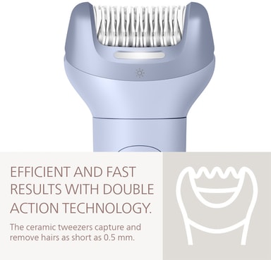 Epilatorn tar bort hårstrån så korta som 0,5 mm, vilket stödjer grundlig hårborttagning med färre drag.