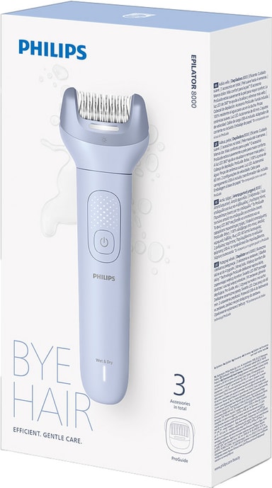 Philips Series 8000 epilator BRE708/00 är en sladdlös våt- och torrepilator för ben och kropp som tar bort hårstrån så korta som 0,5 mm och håller huden slät i upp till fyra veckor. Den har en ProGuide med 360° synlighetsljus för mer precis hårborttagning, erbjuder upp till 60 minuters användning på en laddning och inkluderar tre tillbehör samt en förvaringspåse.