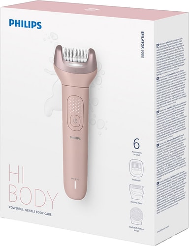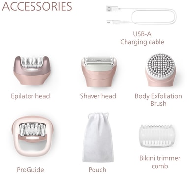 Enheten inkluderar sex tillbehör, såsom en kroppsexfolieringsborste, rakhuvud och trimkam med mera, vilket stödjer en bredare kroppsvårdsrutin utöver grundläggande epilering.
