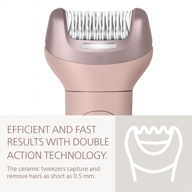 Epilatorn tar bort hår så korta som 0,5 mm, vilket stödjer grundlig hårborttagning med färre drag.