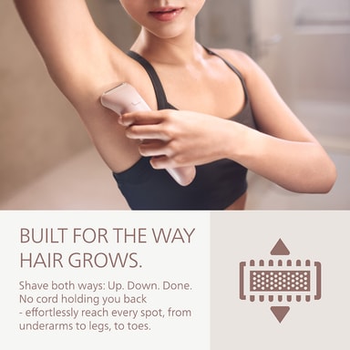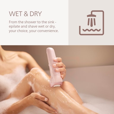 Lämplig för både våt- och torranvändning, epilatorn kan användas i duschen eller på torr hud.