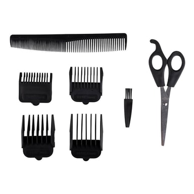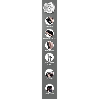 Spara tid och pengar genom att klippa håret hemma! Den här hårtrimmern har fyra distanskammar 3-12 mm, precisionsskär av stål, ergonomiskt grepp och upphängningsögla. Kam, frisörsax och rengöringsborste ingår.