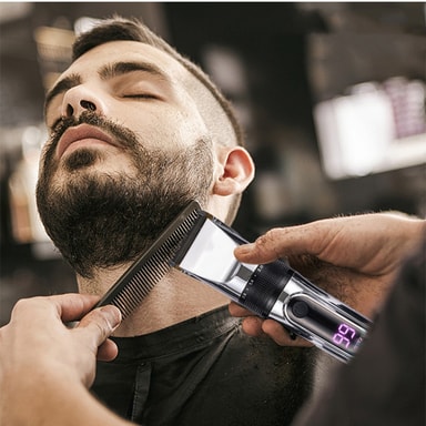 Trådlös och flexibel: Hårklipparen har ett uppladdningsbart batteri med stor kapacitet som ger lång drifttid. USB-kabel för laddning medföljer. Den digitala LCD-displayen visar aktuell laddstatus.