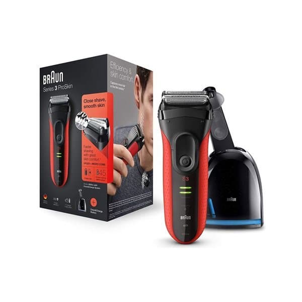 Braun Series 3 3050cc Rakapparat Braun Series 3 ProSkin uppladdningsbara elektriska rakapparat ger snabbare rakning med stor hudkomfort. De 3 tryckkänsliga rakelementen anpassar sig till alla ansiktskonturer och den specialiserade Micro Grip fångar fler hårstrån i första hårkapet. Triple Action FreeFloat-system Tre oberoende rörliga skärelement anpassar sig till varje ansiktskontur och garanterar en smidig rakupplevelse. Inbyggd precision Den extra stora precisionstrimmern på baksidan är idealisk för att forma polisonger eller trimma skägg före rakning. 2x SensoFoil Speciellt utformad för att ge en effektiv nära rakning och en mild hudupplevelse. MicroComb-teknik Den har två rader med fina, jämnt fördelade spår som omger en oberoende rörlig mellantrimmer. Detta fångar mer hår vid varje nedslag , vilket ger dig en snabbare rakning. Skillnaden mot andra rakapparater är märkbar. Rengöring & Laddstation Världens enda 3-action alkoholbaserade Clean & Charge Station. Rengör, laddar och smörjer hygieniskt med en knapptryckning. Att använda Clean & Charge Station är 10 gånger mer hygieniskt än att bara använda rinnande vatten. Utmärkt hantering Det ergonomiska greppet med det ikoniska Braun-gummipunktmönstret ger säker hantering, även i våta badrumsförhållanden eller när du sköljer rakapparaten under rinnande vatten. Triple Action Cutting System Tvillingfolier och en integrerad mellantrimmer rakar sig gradvis närmare. Tillsammans klipper de effektivt både långa och korta hår med varje nedslag, bevisat även på svåra 3-dagarsskägg. 100% vattentät Braun Series 3 ProSkin är IPX7-certifierad - den kan nedsänkas i 5 meter djupt vatten utan problem. Vilket innebär att du bekvämt kan skölja det under rinnande vatten för enkel rengöring. Automatisk spänningsanpassning Smart Plug kommer med automatisk 100-240 spänningsjustering, så att du kan använda din Braun-rakapparat över hela världen när du reser. Kör / laddningstid Full laddning på 1 timme till 45 minuter rakningstid. 5 minuter Snabbladdning räcker för en rakning.