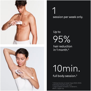 Ett skonsamt men effektivt alternativ till vaxning eller laserbehandling, IPL-teknologin använder upprepade ljusblixtar för att hjälpa dig uppnå och behålla len hud utan oönskat hår över hela kroppen under en lång tid. Dessutom lär sig och anpassar sig det smarta IPL-systemet med varje användning för ännu bättre resultat.