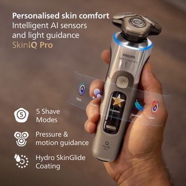 SkinIQ Pro-teknologin erbjuder 5 personliga rakningslägen (Intensiv, Normal, Känslig, Våt, Anpassad) för ultimat hudkomfort. Med realtids tryck- och rörelsevägledning säkerställs den bästa rakningstekniken, anpassad efter din huds behov för en slät, irritationsfri upplevelse.