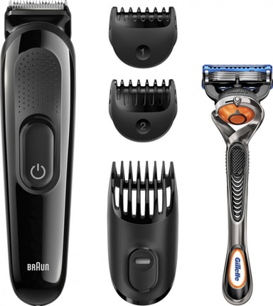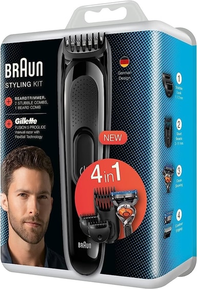 Braun Styling Kit SK3000 Beard Trimmer innehåller 5 olika delar: 1 timmer, 3 kammar och 1 rakhyvel (Gillette Fusion 5 proglide). Trimmern håller i 40 minuter på en laddning.