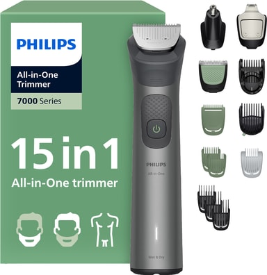 Philips All-in-One Series 7000 multigroomer MG7921/15 är en 15-i-1-trimmer för ansikte, hår och kropp. Den har självslipande blad, precisionskam och flera tillbehör för enkel och exakt trimning.Läs mer om produkten