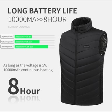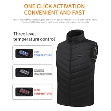 Långvarig värme i upp till 10 timmar: Njut av upp till 10 timmars kontinuerlig värme med en fulladdad powerbank. USB Uppvärmd Väst har tre justerbara temperaturinställningar, vilket gör att du kan anpassa din komfortnivå. Väst är utformad för att ge konsekvent värme utan att leda elektricitet, vilket garanterar säkerhet och komfort. Perfekt för längre utomhusaktiviteter som vandring, camping och fiske, denna uppvärmda väst håller dig varm och bekväm hela dagen. Väst är kompatibel med olika powerbank-märken.