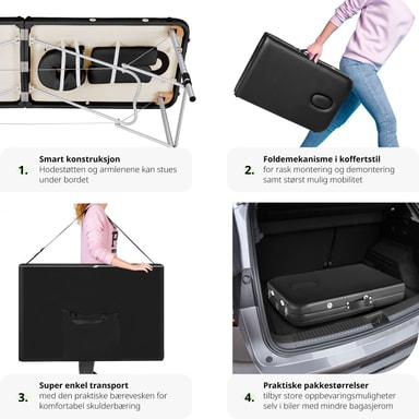 Den medföljande transportväskan gör det enkelt att ta med dig bänken vart du än går, vilket gör den till en populär lösning för massörer på språng eller för den som har begränsat utrymme. Tack vare sin portabilitet och bekvämlighet blir vår portabla massagebänk snabbt en favorit bland användare som söker en lättillgänglig massagebänk som är enkel att förvara och transportera.