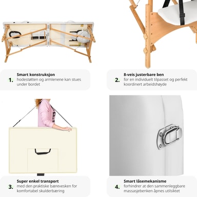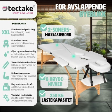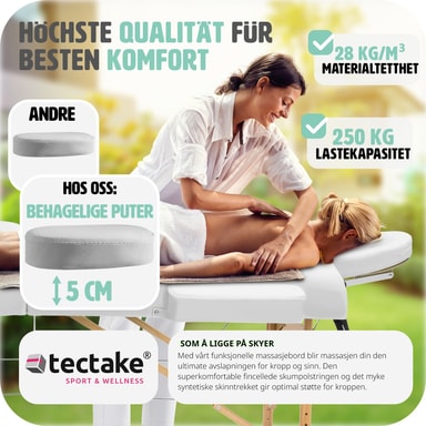 Vår massagebänk erbjuder en enastående massageupplevelse och hög komfort för avslappning. Den är enkel att fälla upp och tack vare det snabba och smidiga fällsystemet går det lika lätt att transportera eller förvara den kompakt. Ge eller få en fantastisk massage med denna behandlingsbänk från tectake.