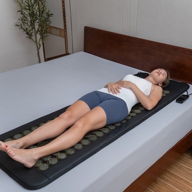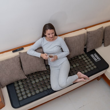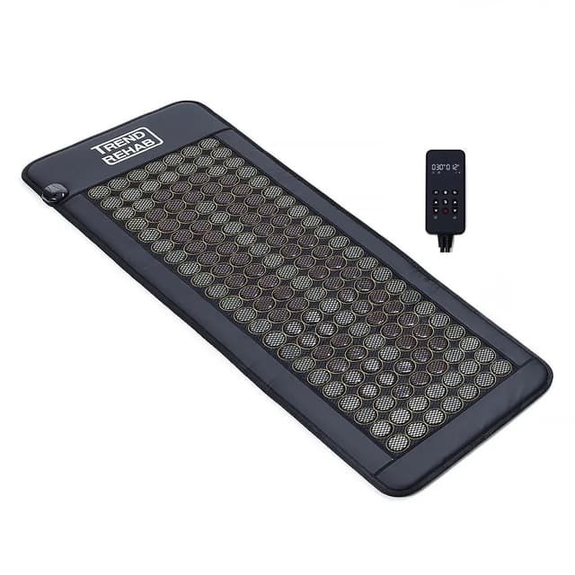 Upplev den behagliga känslan av djupgående värme med vår exklusiva inframadrass, designad med 71 turmalinstenar och 83 jadestenar av hög kvalitet. Stenarna, med en diameter på 50 mm, är jämnt fördelade för att skapa en lyxig och avslappnande upplevelse. Den generösa värmeytan på 42 x 146 cm omsluter kroppen och bidrar till en känsla av ro och komfort. Madrassen har inbyggt temperatur- och överhettningsskydd, vilket gör den trygg och enkel att använda. Värmen sprids jämnt över hela ytan, och vi rekommenderar att du använder tunna bomullskläder, ett lakan eller en handduk över madrassen för ökad komfort och hygien. Infravärmen i kombination med jadens värmebevarande egenskaper och turmalinens välkända användning inom wellness skapar en harmonisk stund i vardagen. Perfekt för dig som vill unna dig avkoppling, återhämtning och en känsla av välbefinnande.