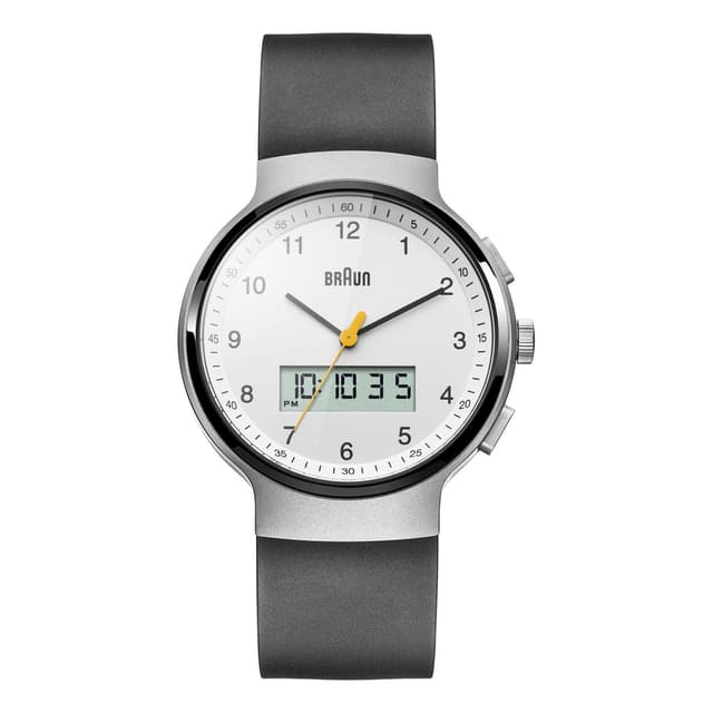 Denna klassiska Analog-Digital klocka är den första i Brauns kollektion att kombinera de klassiska elementen i en analog klocka med de funktionella aspekterna av en digital klocka. Digitala funktioner i den här dubbla analoga digitala klockan inkluderar: dubbeltid, dag, datum, alarm, kronograf och EL-bakgrundsbelysning. Finns med ett svart gummiband som är speciellt utformat för extra komfort.