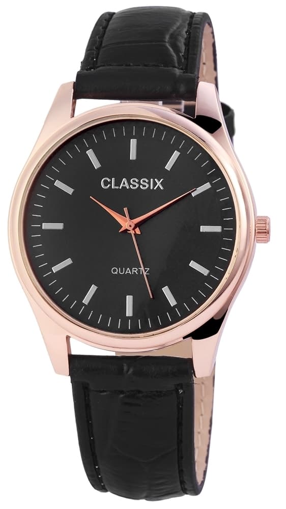 Classix herrklocka med läderarmband klassisk herrklocka med svart armband i läderimitation och svart urtavla. Med detaljer i silver och roseguld sticker klockan ut från mängden.