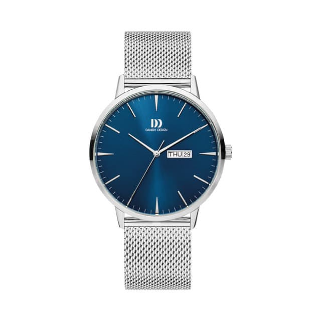 Denna klocka från danish design har en 41 mm. Rostfritt stålhölje som innehåller en kvartsrörelse. Klockan har en blå urtavla med dag- och datumvisning, mineralglasglas och är vattentät i 30 meter.