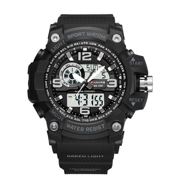 Digital armbandsklocka i sportmodell med många användbara funktioner.