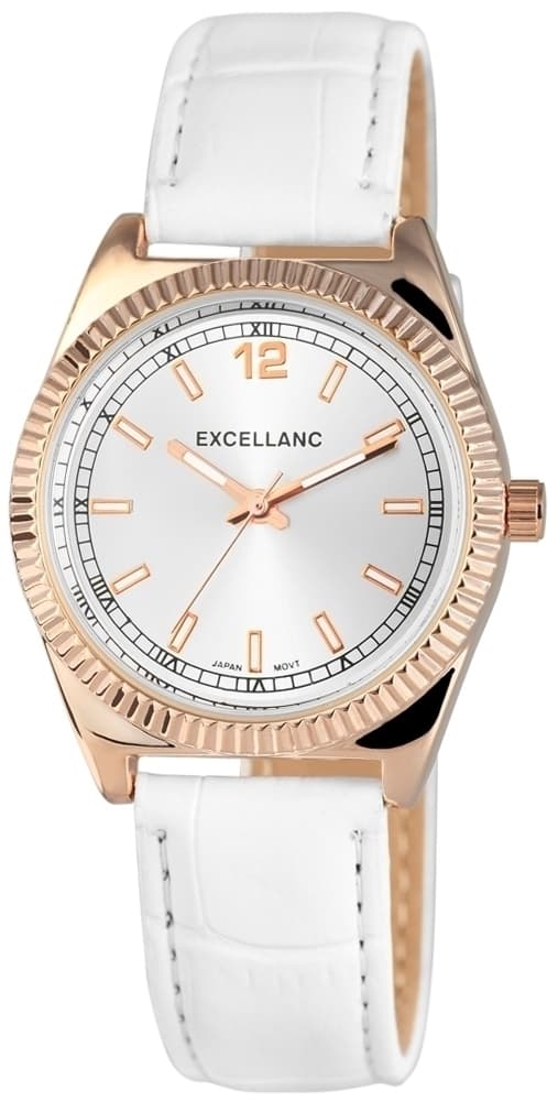 Excellanc damklocka med läderarmband modern klocka med vitt armband tillverkat i imitations läder. Urtavlan är vit och klockan har guldiga detaljer som ger klockan extra elegans. Klockans armband är 18 mm brett och 23 cm långt vilket passar de flesta handleder.