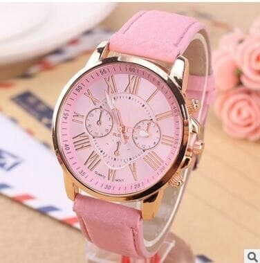 Rosa damklocka snygg klocka med en urtavla i guld och ljusrosa konstläderarmband. På klockans urtavla finns tre mindre urtavlor perfekta för tidtagning då de visat minuter och sekunder.