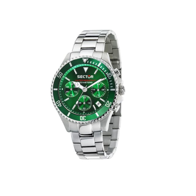 Material och finish: rostfritt stål, fodral: 50,2x43mm, färgtjocklek: 11,9, färg: färg: grön, kristall: mineralkristall, rem material: metallarmband, remsfärg: stål, rörelse: kvarts, lås typ: spänne , vattentålig: 10 atm, garanti: sektor 2 års garanti, förpackning: sektor originalförpackning