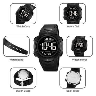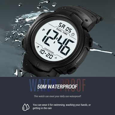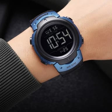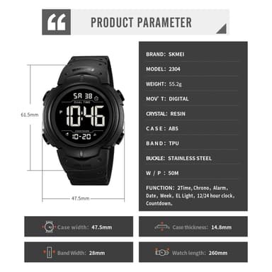 【Multifunktionell Design】Denna SKMEI 2304-klocka har dubbel tidsvisning, stoppur, datum, alarm, veckodag och nedräkningstimer, perfekt för utomhusträning och vardagsbruk.