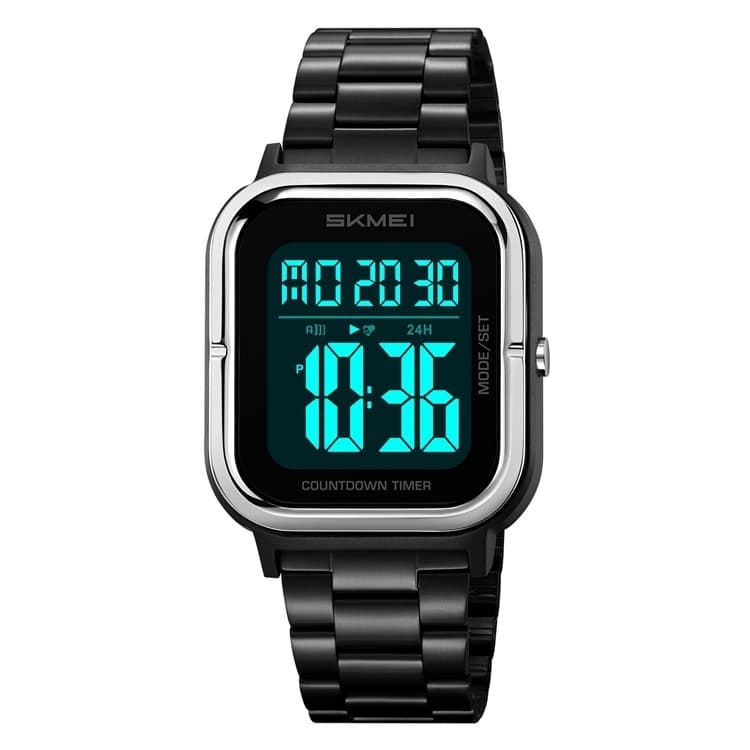 SKMEI 2316 50m Vattentät Digitalklocka Fyrkantig Elektronisk Armbandsur med EL-bakgrundsbelysning och Stoppur - Silver+Vit / Stålarmband